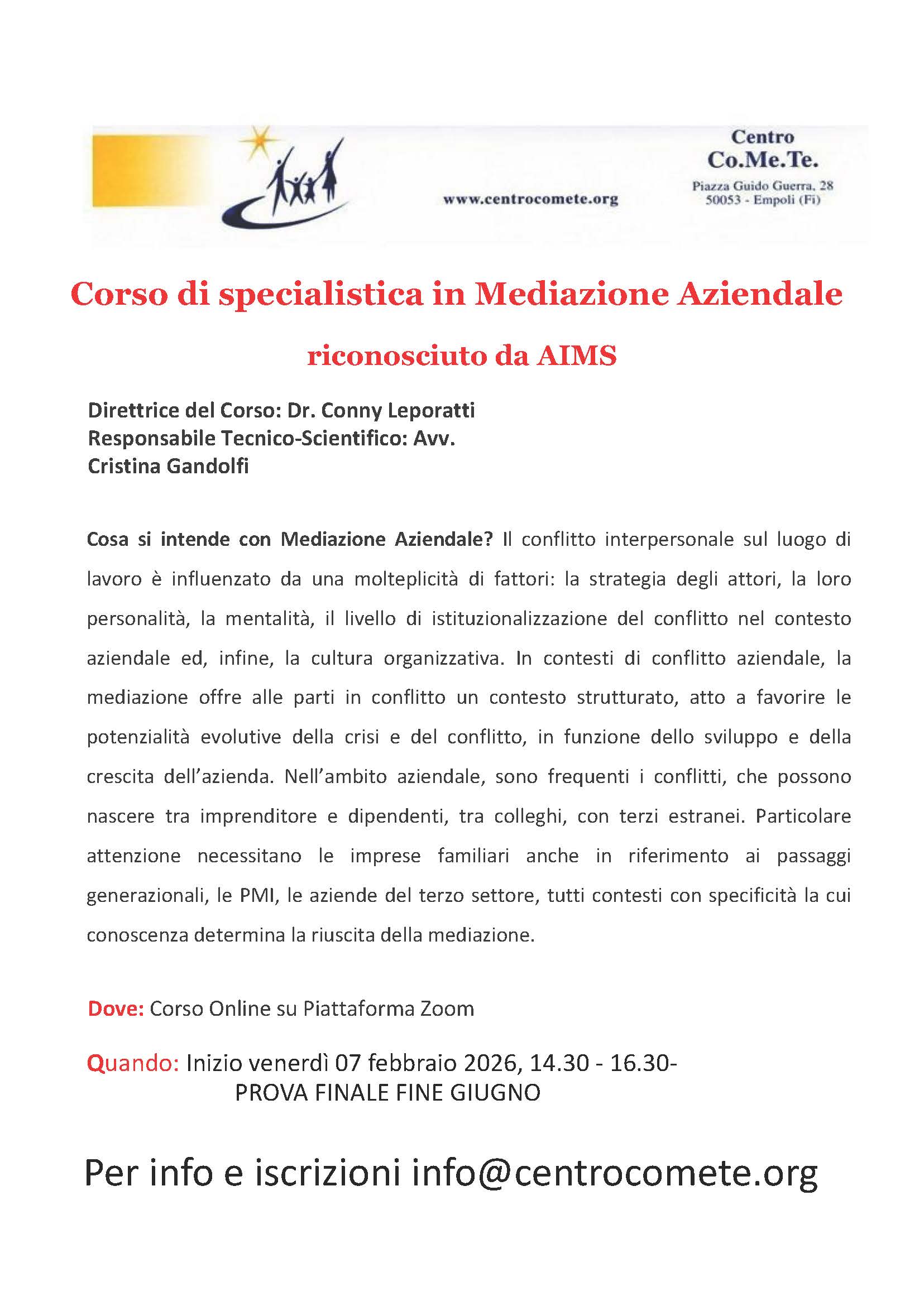 Per informazioni sul corso con date aggiornate e iscrizioni - info@centrocomete.org