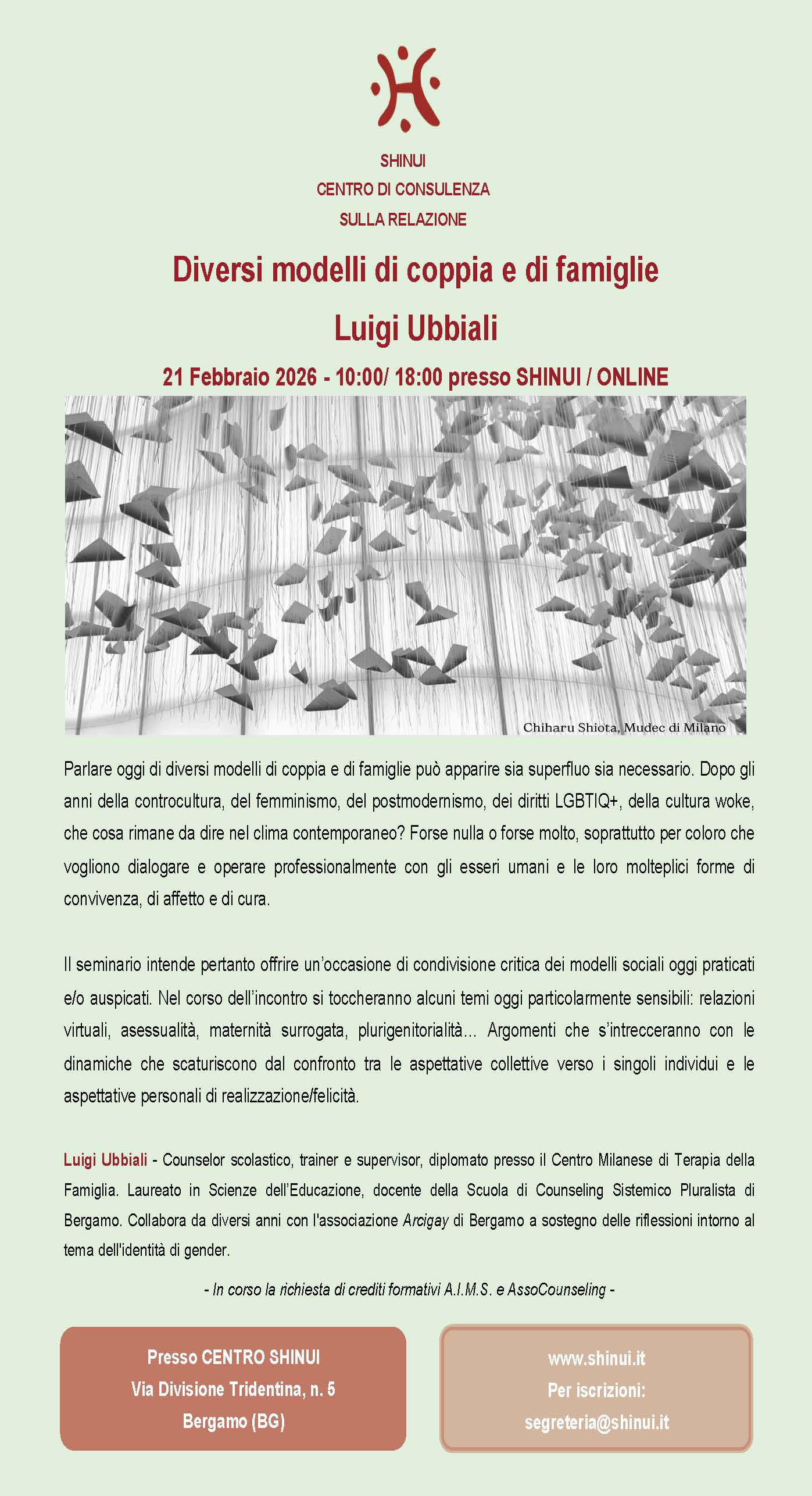 L’evento ha ottenuto 6 crediti formativi AIMS con prot. n 113 ac 2025 del 22/12/2025 https://www.shinui.it/it/diversi-modelli-di-coppia-e-di-famiglie.html www.shinui.it Per iscrizioni: segreteria@shinui.it